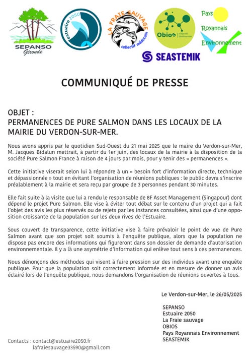 - SUD OUEST – Les associations opposées au projet Pure Salmon réclament des réunions publiques