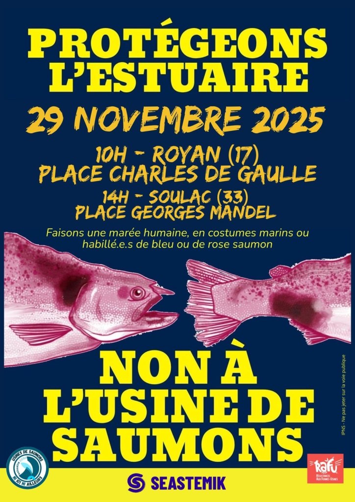 Avec les collectifs mobilisés dans la lutte, rassemblés sous la bannière « Usines de Saumons, pas question » dont Estuaire 2050, Seastemik et La Fraie Sauvage font partie, nous avons décidé d’organiser un évènement public pour la préservation de l’estuaire de la Gironde. Nous organisons trois « évènements » simultanés à Royan, Le Verdon-sur-Mer et Bordeaux, s’inscrivant dans la semaine contre les fermes-usines porté par le collectif RAFU (Résistance Aux Fermes Usines)